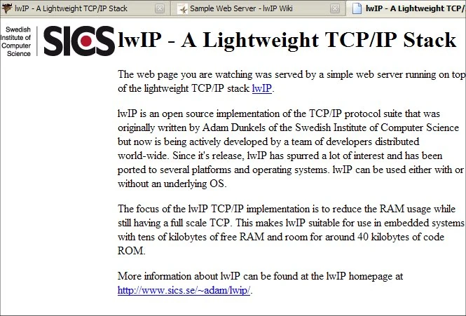 To use this sample application, include httpd.c, fs.c and fsdata.c and the associated header files to your project. Add a call to httpd_init() to initialize the daemon after calling lwip_init() to initialize the stack. If all is good, pointing a Web browser at your lwIP implementation's IP address should display the provided default file system index page.